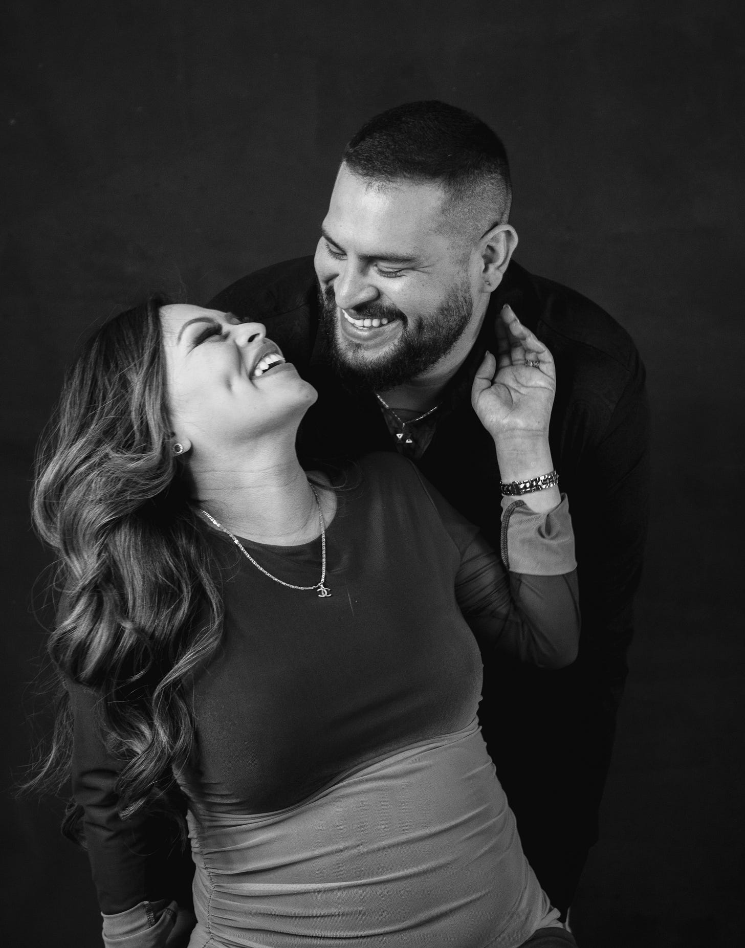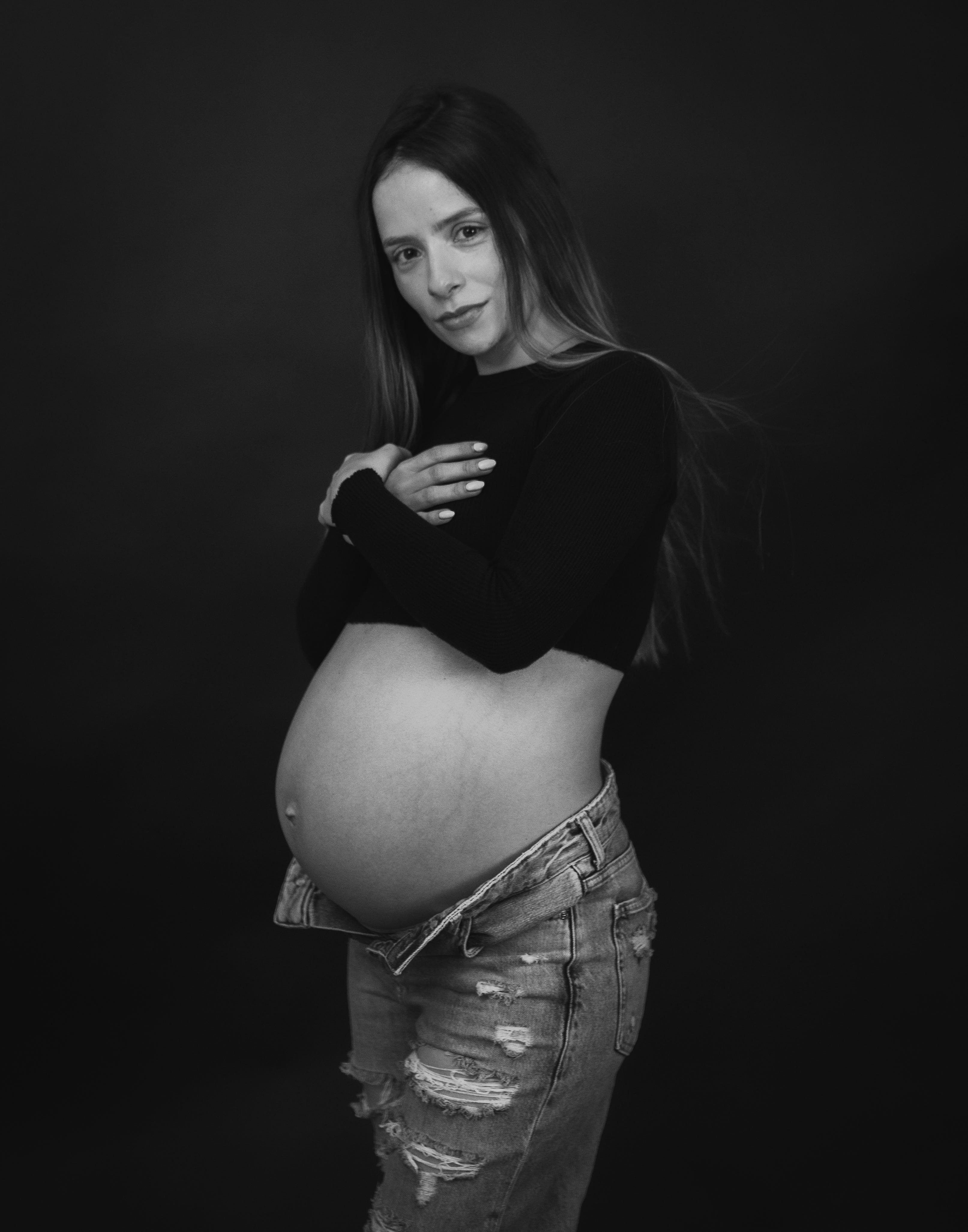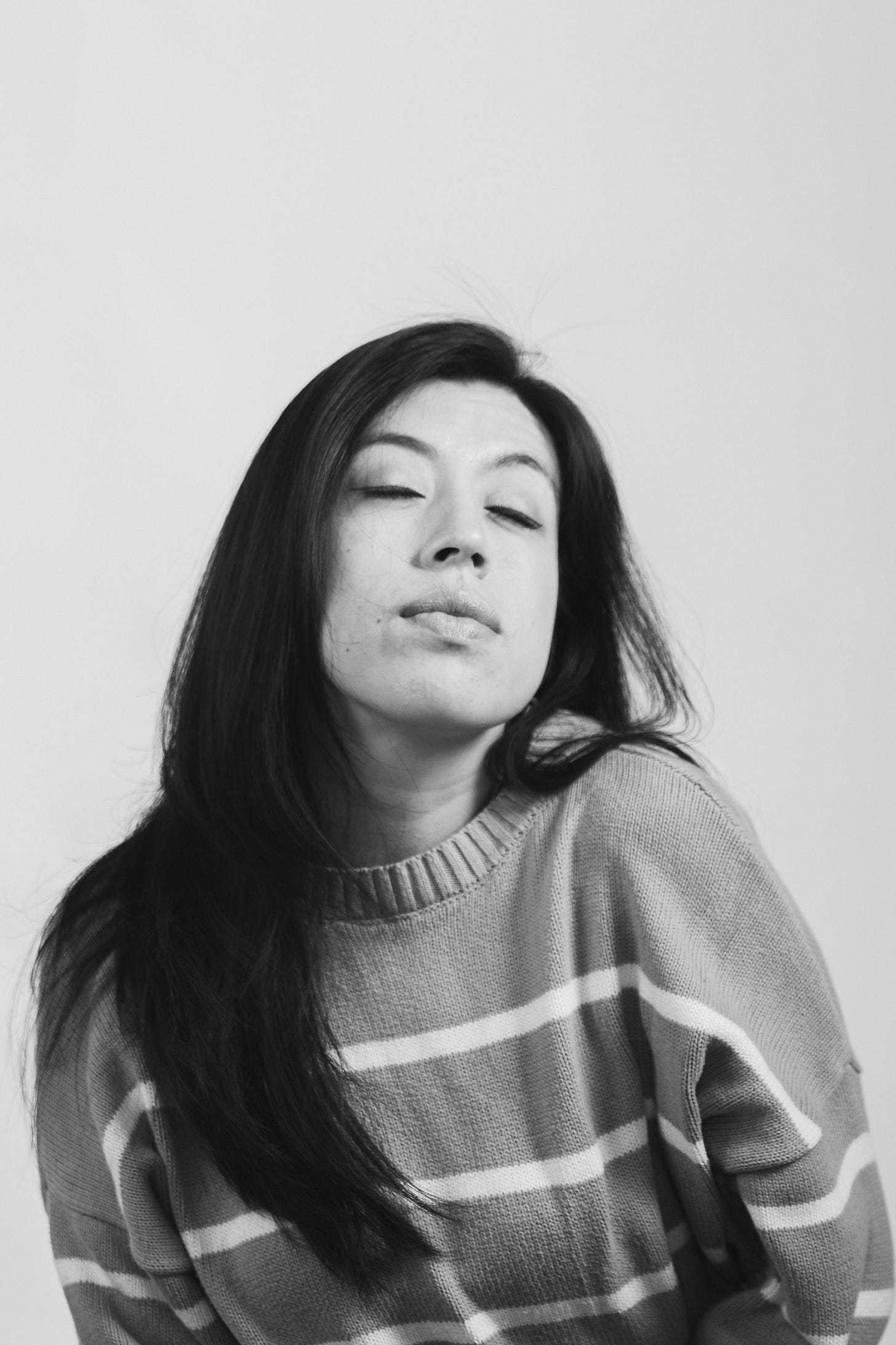 También aprendí que mientras más simple el entorno, más profundo el resultado. Al principio invertí en demasiadas cosas: fondos distintos, difusores de todo tipo, decoración, objetos que prometían personalidad. Con el tiempo vendí mucho de eso o simplemente dejó de usarse. Mientras más afinaba mi estilo y entendía a quién quería fotografiar, más claro se volvió que la simplicidad me daba libertad. El color nunca ha sido mi predilección, siento que distrae de lo esencial. En el blanco y negro encontré una forma más silenciosa de hablar, de quitar ruido y quedarme con gesto, textura y mirada. Hoy el estudio se reduce a dos fondos, dos flashes, un 50mm y un 85mm. No necesito más.